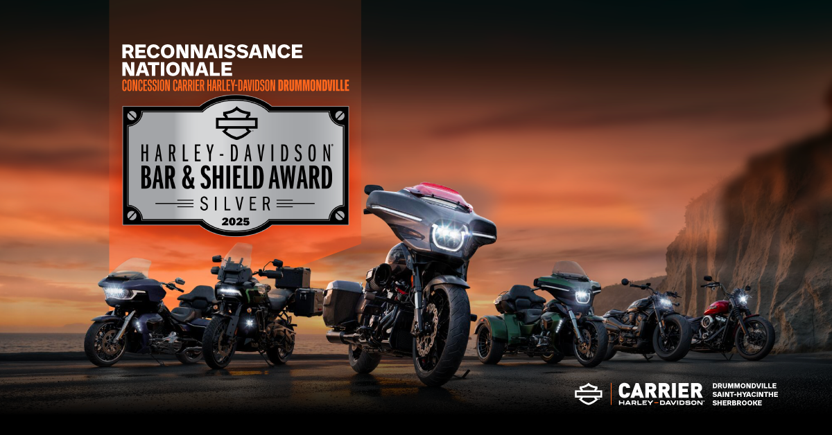Nous sommes fiers de vous partager cette grande nouvelle, et c’est tout un honneur pour Carrier Harley-Davidson Drummondville de recevoir le Silver Bar & Shield Award, qui est remis à seulement deux concessionnaires au Canada.