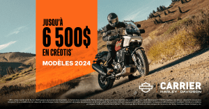 Jusqu’à épuisement de l’inventaire, obtenez jusqu’à 6500$ en crédits à l’achat d’une moto Harley-Davidson 2024 en inventaire.
